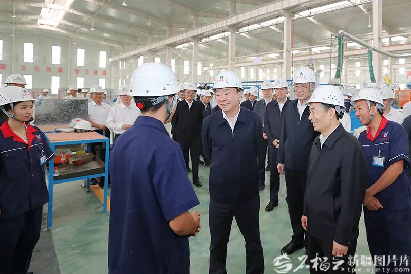 9月5日,广东省委书记黄坤明、自治区党委书记陈小江等在喀什经济开发区兵团分区,详细了解园区企业生产经营、吸纳就业等情况。石榴云/新疆日报记者 崔志坚摄